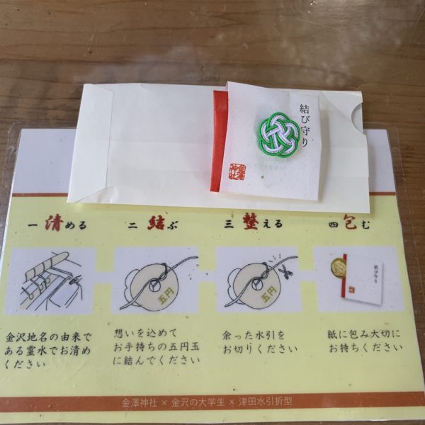 期間限定で水引御守(加賀水引)があったので、福が来るよう、五円玉に想いを込めました。